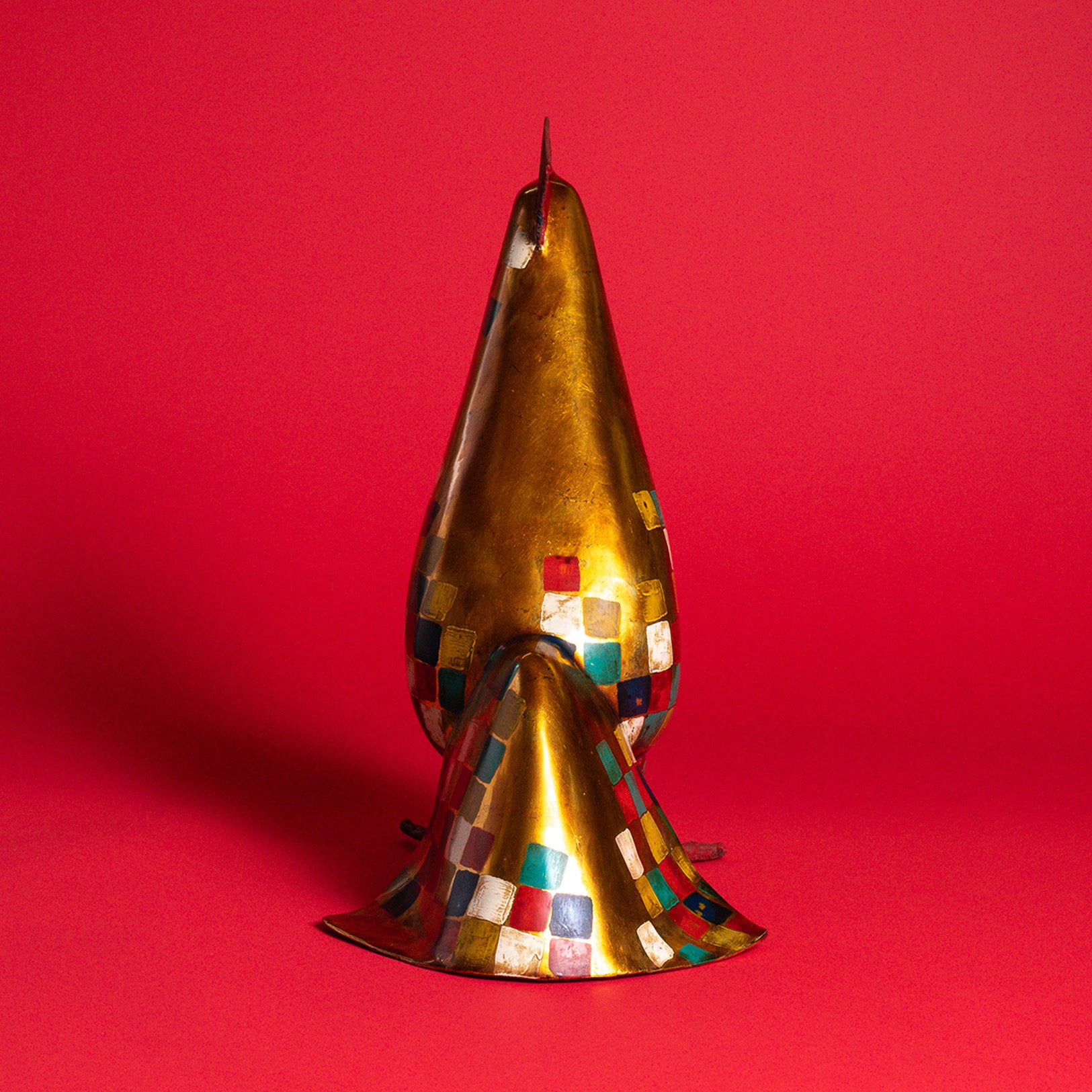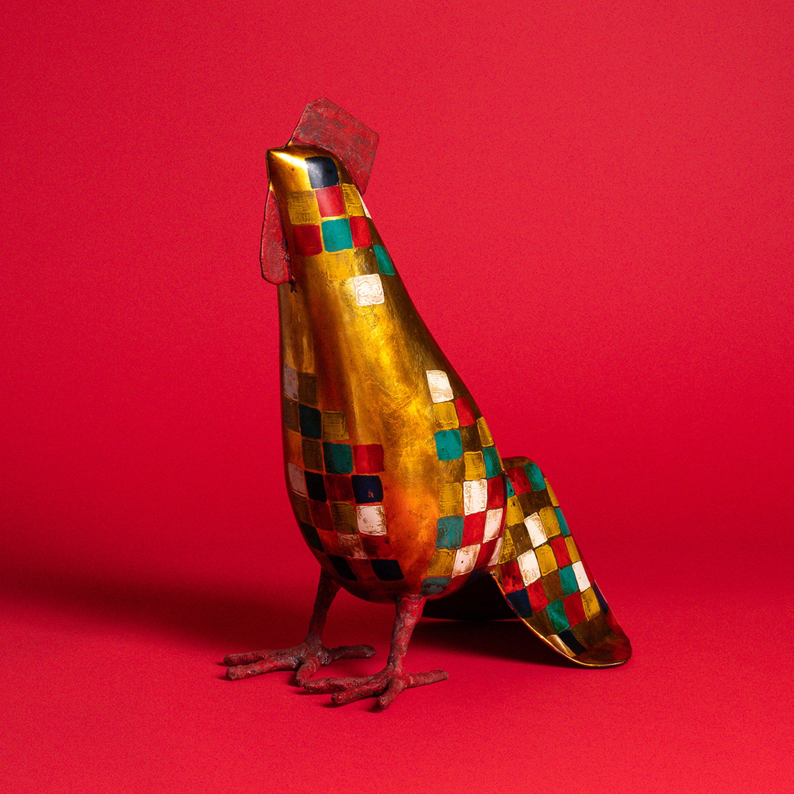 Bold and full of character, the Golden Patchwork Rooster is a hand-painted sculpture made from lacquer composite in Vietnam. Its shimmering gold body is accented with a colorful mosaic of geometric squares and a bright red comb, bringing a spirited charm to any space. Whether perched in a kitchen or entryway, this vibrant piece adds a dash of artisanal flair and joyful energy.
