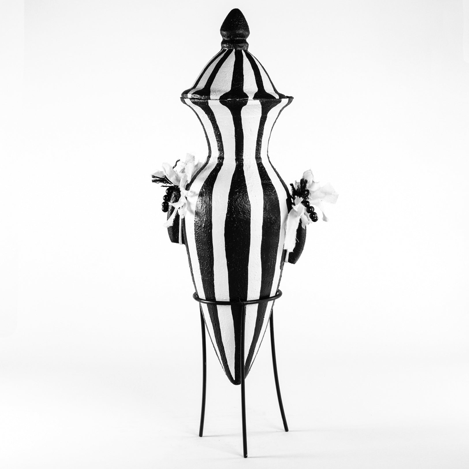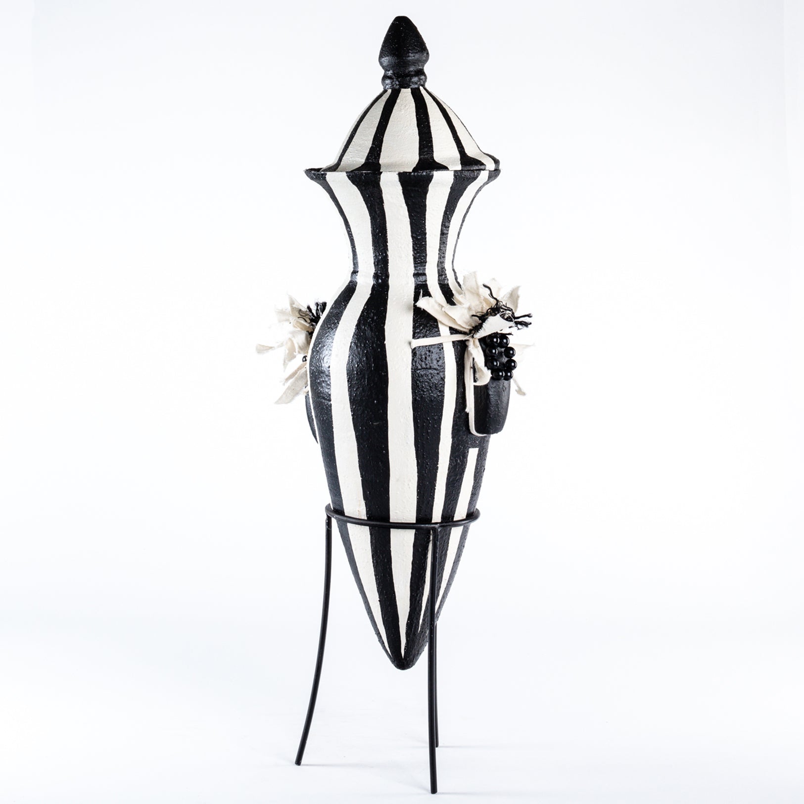 This majestic urn is a nod to the grand pavilions of Marrakesh, featuring a conical lid, pointed finial, and bold vertical stripes. Resting on an elegant metal stand, it brings height and drama to any corner. Black beadwork and monochrome fringe add a playful yet elevated touch to its commanding silhouette.