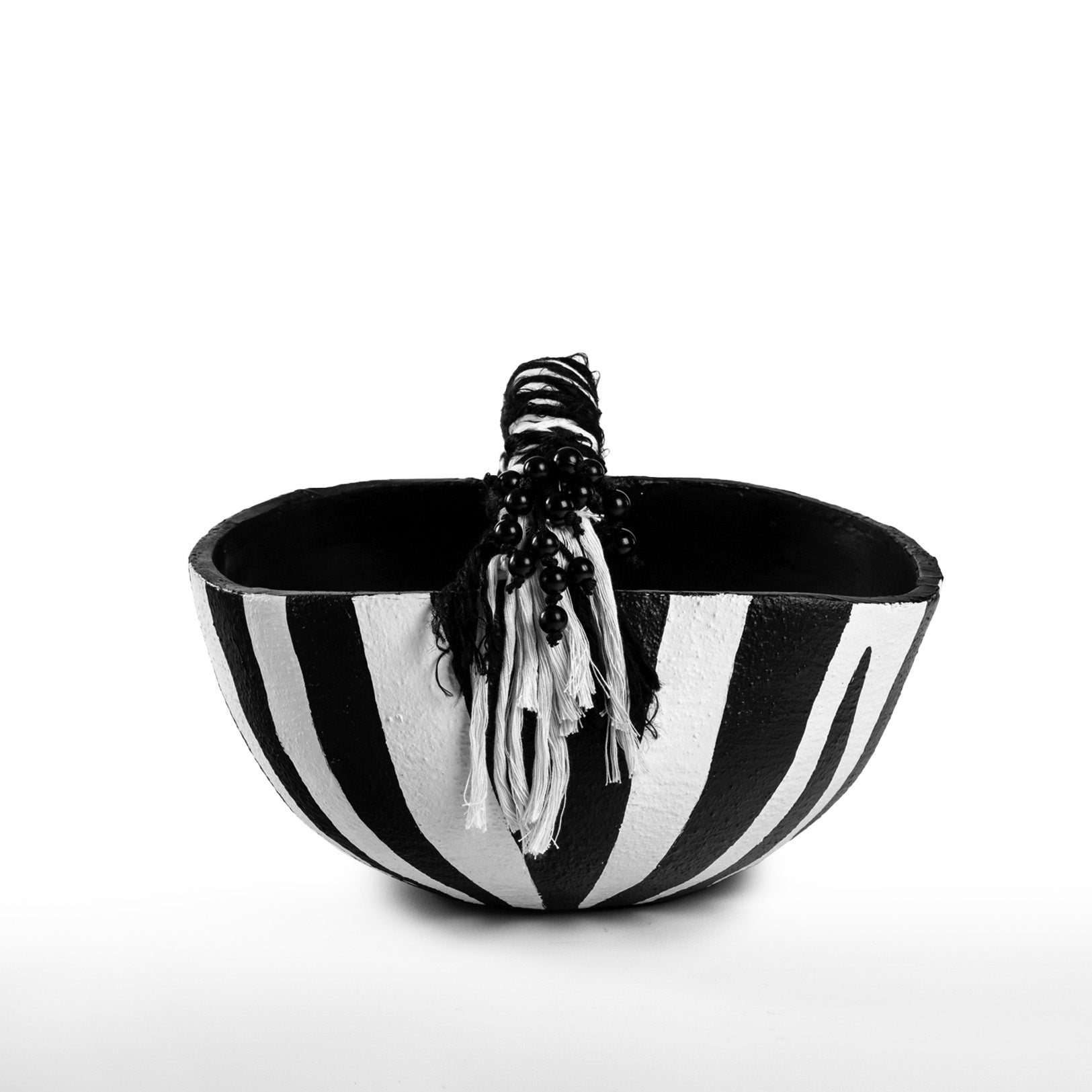 Crafted in Morocco using a composite blend chosen for strength and visual weight, this piece balances tactile texture with refined detail. Each stripe is applied by hand in matte black strokes over a soft, white base. The handle is adorned with hand-braided cord, polished black beads, and layered fringe—each element assembled by skilled artisans.