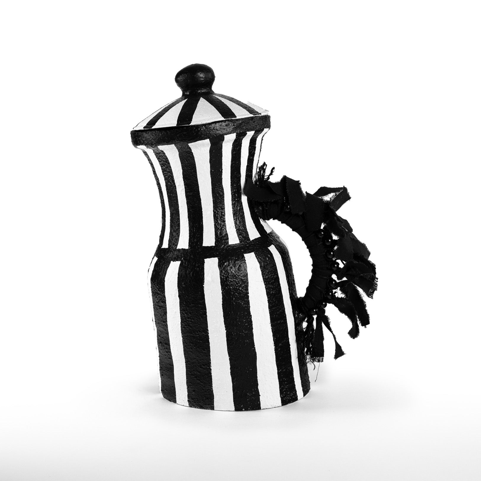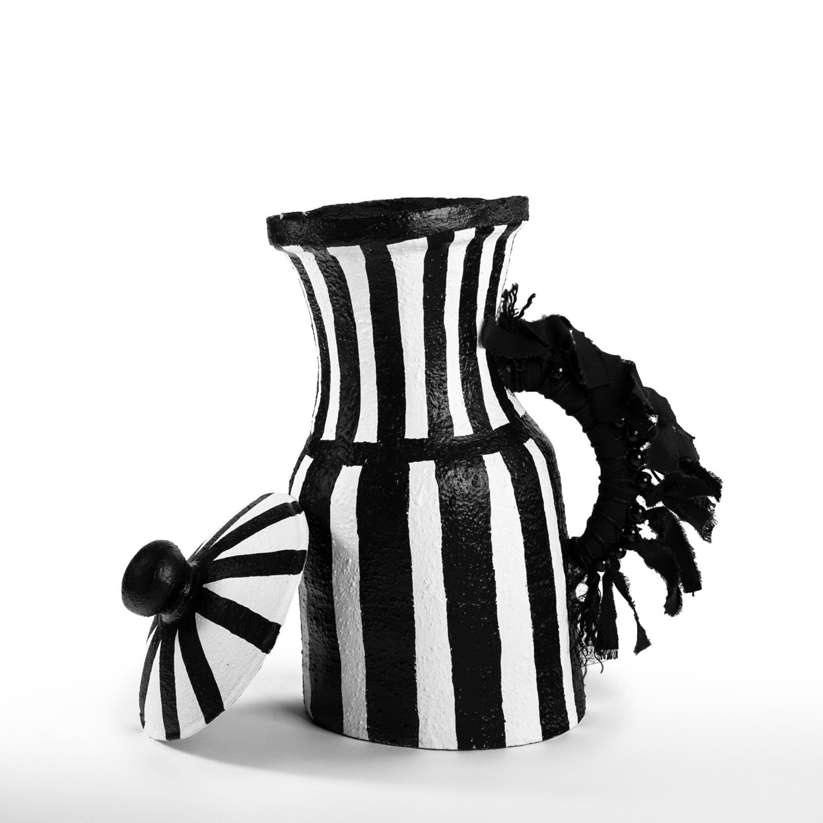 Handcrafted in Morocco, this piece is made from a composite of durable mixed materials, offering the look of ceramic with lighter weight for ease of styling. The surface is hand-painted in black stripes over a matte, lightly textured base. The added embellishments—beads and raffia—bring a sense of ceremonial flair while staying true to the artisan's signature techniques. As with all JJUIN pieces, only the finest materials are used and refined through mentorship and collaboration.