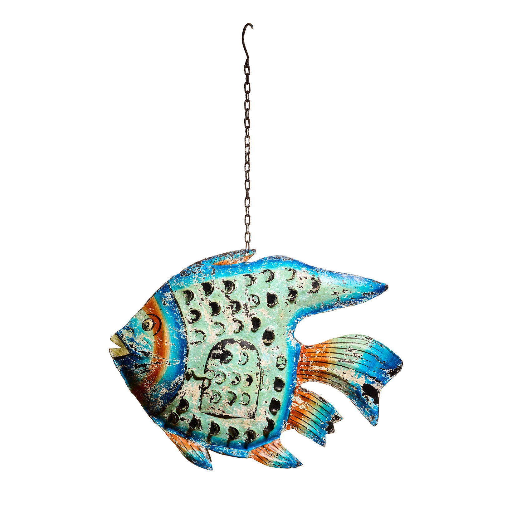 This piece is shaped from hand-cut metal, painted in a base of pale mint green with layered strokes of blue and soft orange. The surface is then hand-distressed to reveal darker markings and areas of exposed blackened metal, giving the piece a worn, sea-aged look. The body is detailed with a repeating raised dot pattern, adding texture and the impression of stylized scales. A hinged side door provides space for a tealight, and a sturdy metal chain allows for hanging from a hook or bracket.